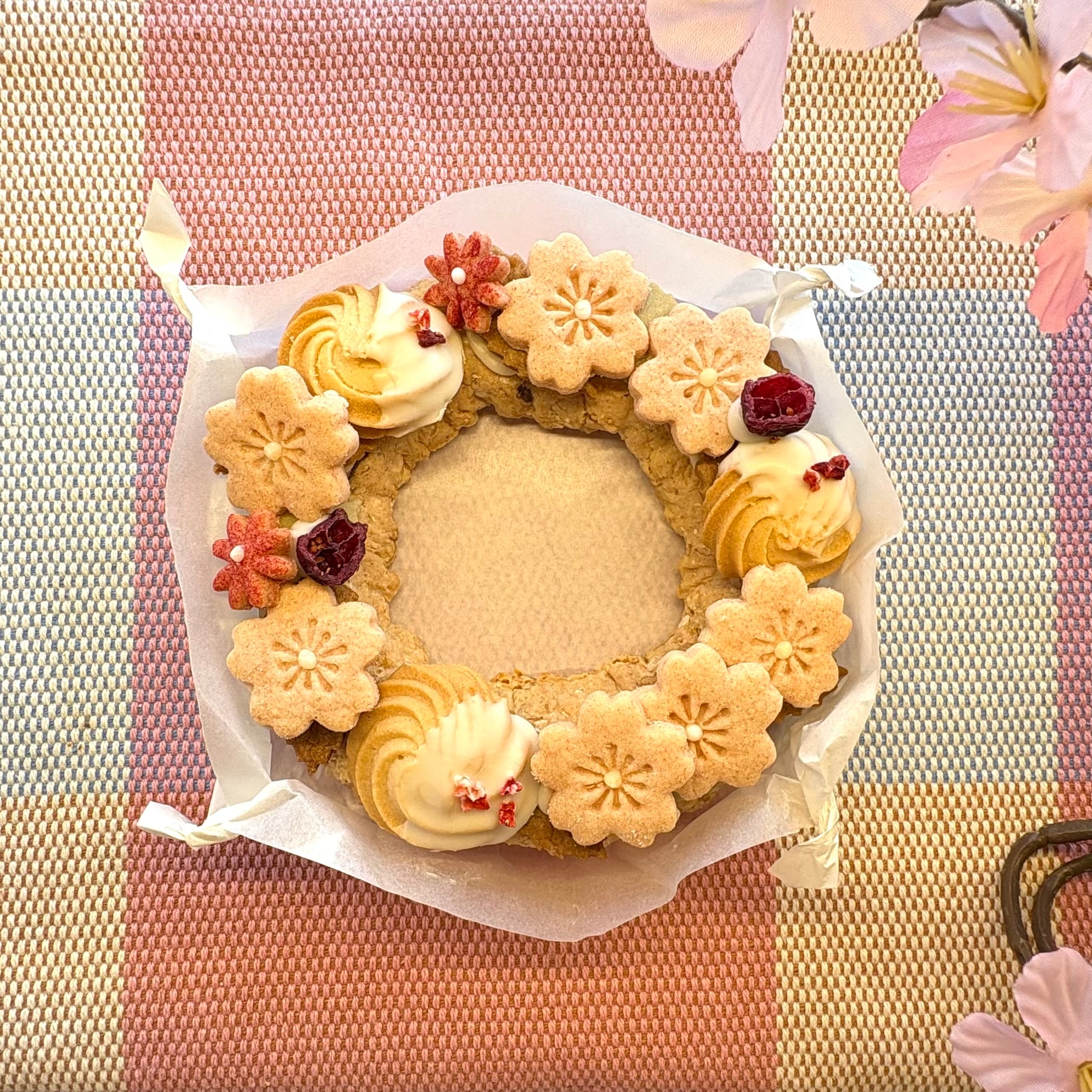 季節限定「桜のリース」は、クーベルチュールチョコレートを練り込んだビスコッティで作ったベースに、風味豊かなクッキーやドライフルーツを飾りつけた、当店オリジナルのお菓子です。