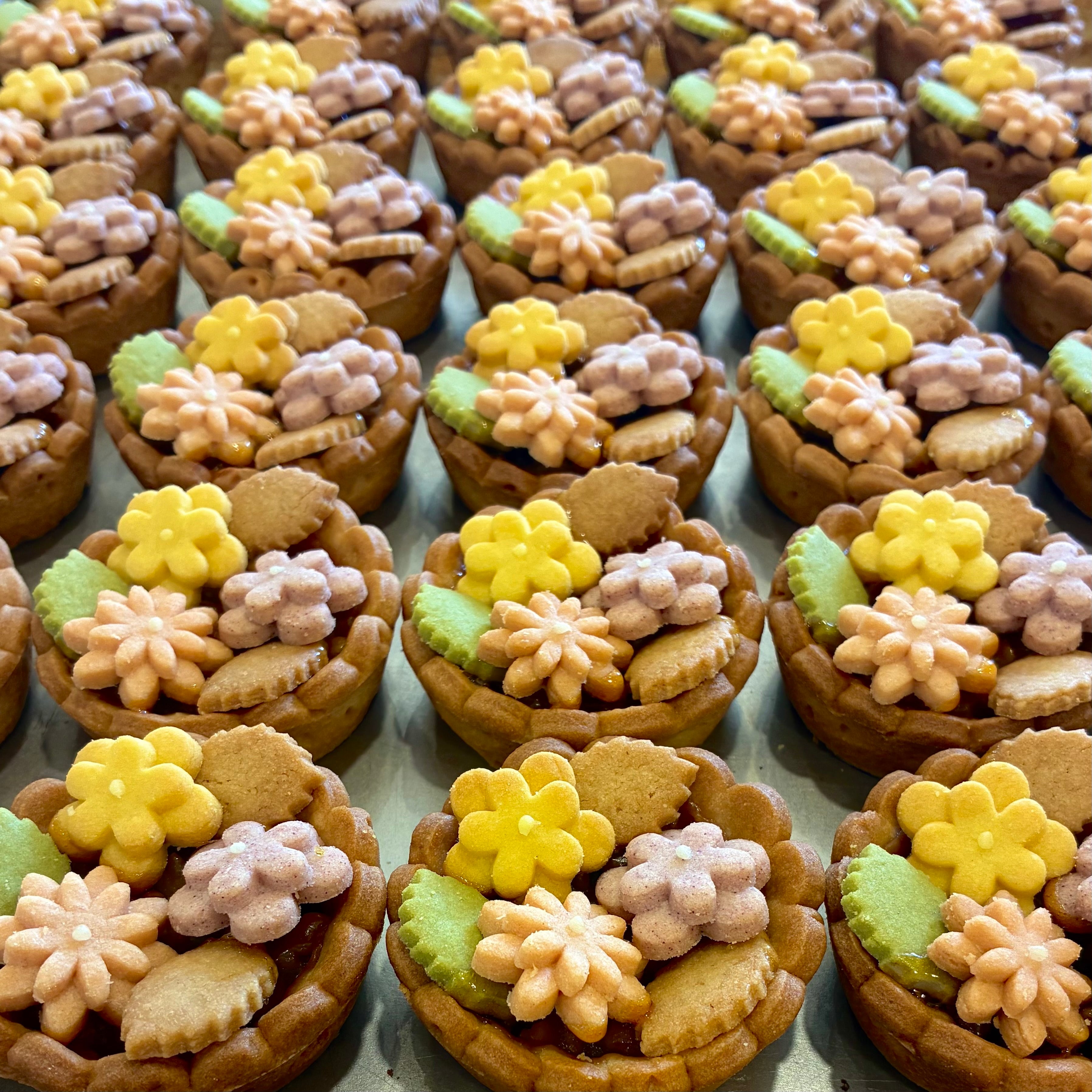やわらかめのクッキー生地にクルミヌガーを敷き詰めたベースに、鮮やかに色づいたお花のクッキーが咲き誇ります。